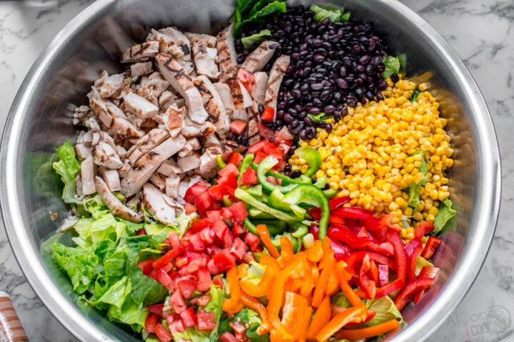This Southwest Salad recipe makes a large batch since it calls for 5 heads of romaine lettuce! If you ever shop at Costco there Romaine lettuce comes in a bulk package of 6. Canned beans and corn are pretty efficient and you only need tomatoes and bell peppers as the fresh veggies. The ready-to-use grilled chicken pieces can be found at Aldi grocery stores in the fridge section. I purchased fajita-style grilled chicken pieces.