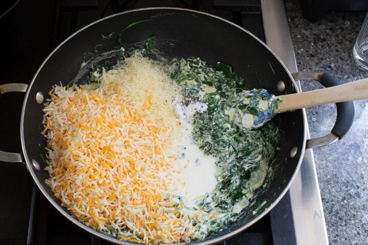 The ingredients for spinach dip are simple. If you have a jar of marinated artichoke hearts you can mix it into the cooked spinach but I don’t always have it on hand, so I go without it. Pick and choose a melting cheese of choice, this dip is so versatile!