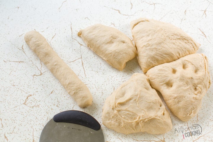 - Transfer dough onto a floured surface and cut into 4 equal pieces. Cut each piece in half again to make a total of 8 pieces.