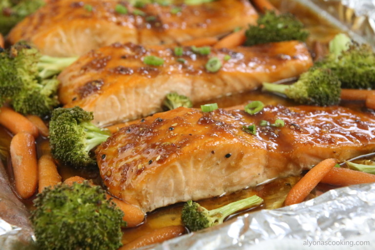 My mother who managed to finish a huge 2-3lb salmon with my sister in almost one day gave me the recipe to this incredibly tasty salmon recipe. My husband totally approved this salmon recipe (as salmon get be a bit bland and dry, but not this one.) And if only the tail of a huge fish was left the next day from my mom making this fish, you can be sure this recipe is a keeper! I’m totally loving the semi-sweet and sticky Asian Inspired flavors going on and the veggies…. Oh there so good baked in all that good flavor. You have yet to try this super easy and quick one pan meal the next time you have salmon on hand.