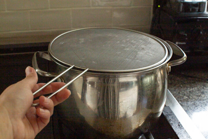- Bring 2 quarts of water to a boil in a large pot. Place a splatter screen or steaming basket over the pot.