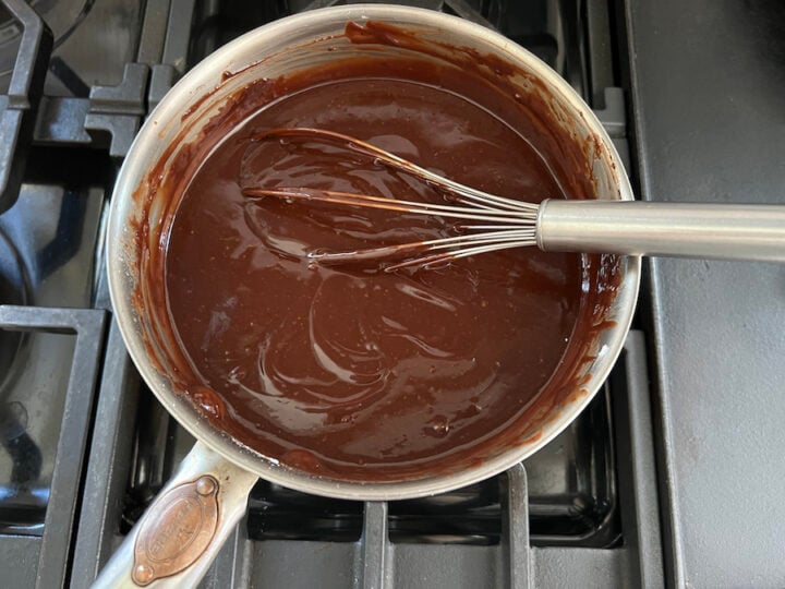 - Make the fudge frosting: combine all of the frosting ingredients in a small saucepan and bring to a simmer. You just want to melt the sugar. Pour into a 9×13 and slightly cool, then place plastic wrap over the top so the chocolate frosting doesn’t form a skin. Cool in the refrigerator for 30 minutes until the frosting thickens.