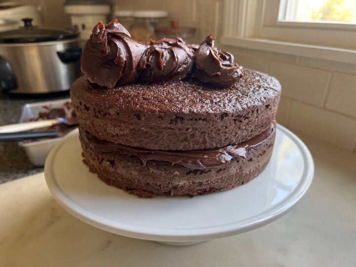 It’s important to start with the right tools. I measure my grains with a scale for consistent results and use two 9-inch cake pans. You can use a hand mixer or whisk and mix everything in one bowl but I prefer to use my kitchen aid mixer. The fudge frosting couldn’t be easier to make as you melt all the ingredients in a saucepan and then cool to frost.