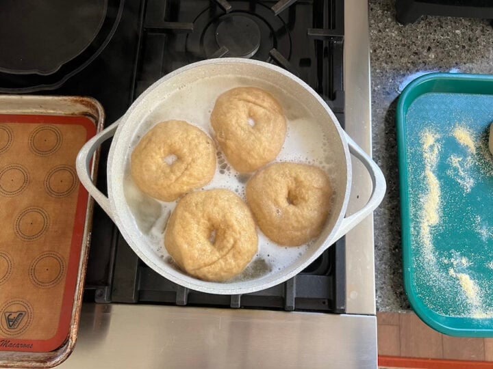 - Drop the bagels into boiling water 4 at a time and boil for 60 seconds on each side. Flip the bagels over using a slotted spoon with holes.