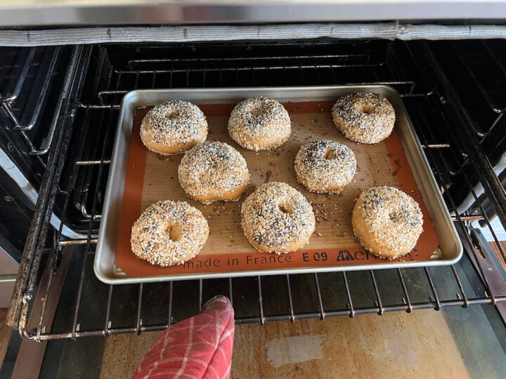 - Place bagels on a silicone-lined baking sheet and allow the dough to rise for up to 2 hours in a warm spot.