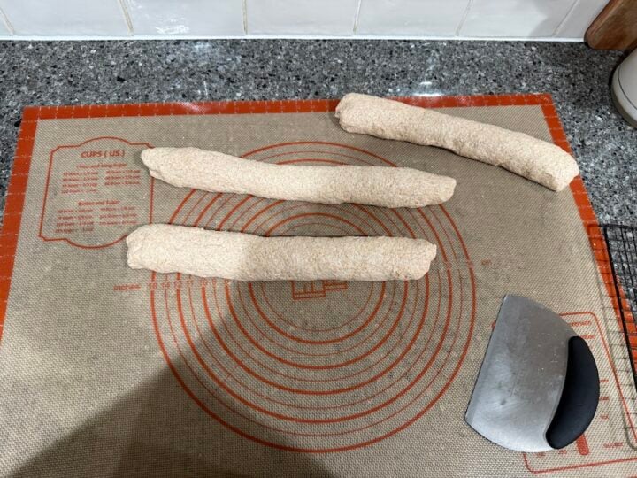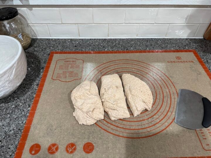 - Invert the dough onto the mat and divide the dough into three equal parts using a bench scraper.