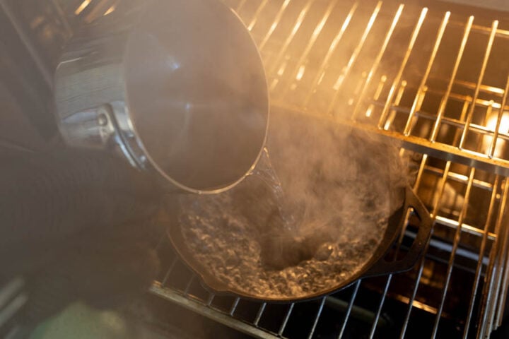 - Meanwhile, preheat the oven to 500°F with a large cast-iron skillet on the bottom rack. Boil water in a medium saucepan. Carefully pour the boiling water into the preheated skillet.
