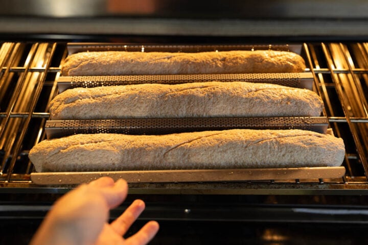 - Reduce the oven temperature to 450°F and bake the sourdough baguettes for 30-35 minutes.