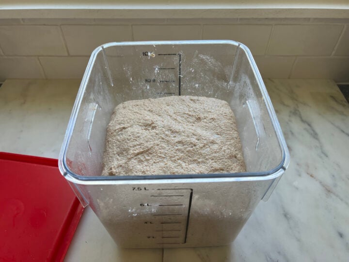 - In the morning around 9 AM, I’ll mix part of the dough and let it rest for 30 minutes. This is the flour, starter, and water only.