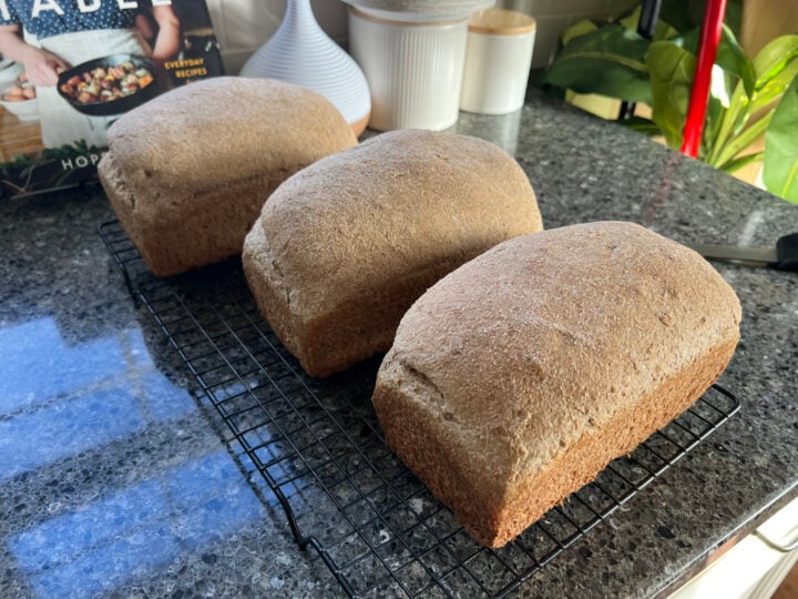 This sourdough sandwich bread is an all-time favorite! It’s made with all, freshly milled flour and sourdough starter. No more dense whole wheat bread the texture is amazing with a soft and moist crumb and ever so lightly tangy taste. You can cut this thin or thick and freeze the other loaves for later! It keeps well.