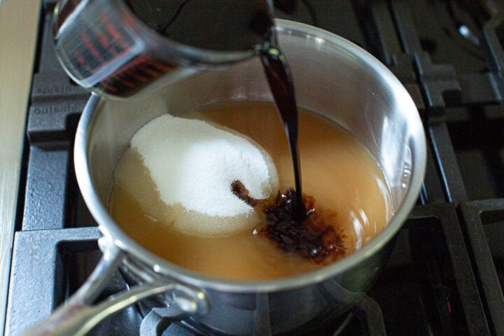 In a medium saucepan, combine 1/3 cup of apple cider vinegar, 1/2 cup soy sauce, and 3/4 cup of sugar.